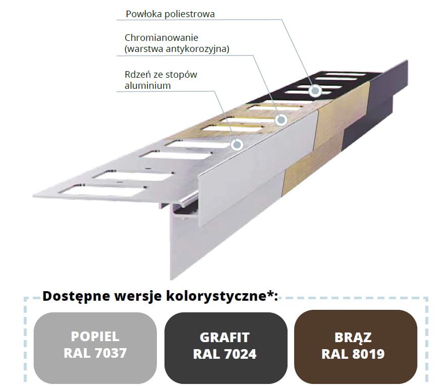 Profil okapowy do tarasów i balkonów w kształcie łuku (półokrągłe) przeznaczony do posadzki z płytek ceramicznych układanych na kleju (tradycyjnie).