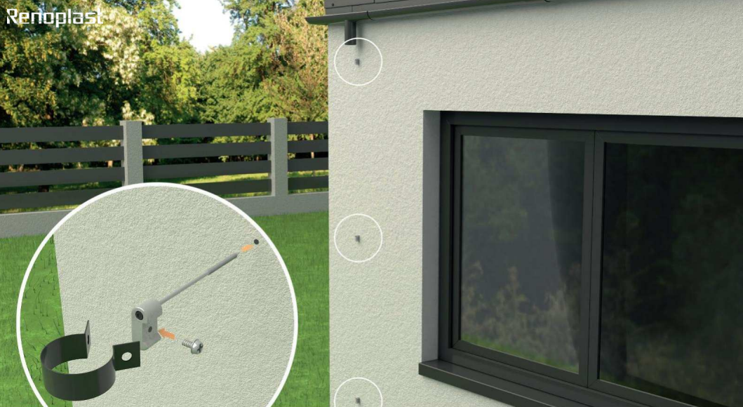 Obejma do systemu rynnowego R50, umożliwia montaż rury spustowej do ściany elewacyjnej.