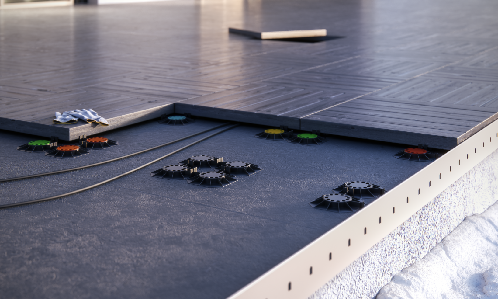 Podkładki dają nam szybkie i stabilne wykonanie posadzek zarówno z płyt kamiennych, betonowych, ceramicznych grubowarstwowych oraz desek kompozytowych i naturalnych. Przestrzeń, która tworzy się między płytkami a zaizolowaną posadzką pozwala na łatwe odprowadzenie wody.